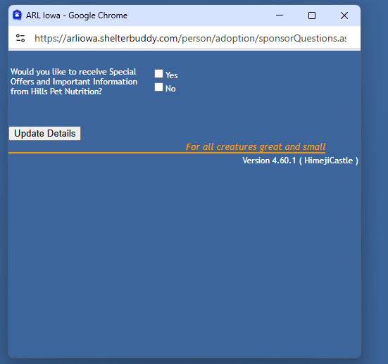 If your ShelterBuddy process includes this blue screen for Hill's Offers it is a legacy solution and please follow the instruction above to get ShelterBuddy's update consent feature.