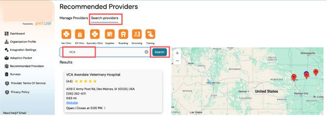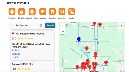 You can add recommended local providers through your dashboard, making them visible in a map view for adopters.