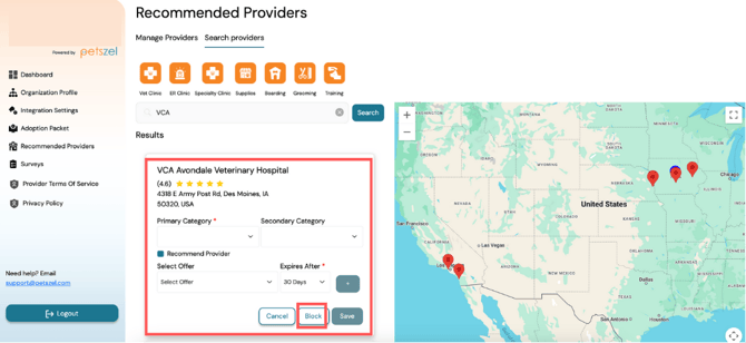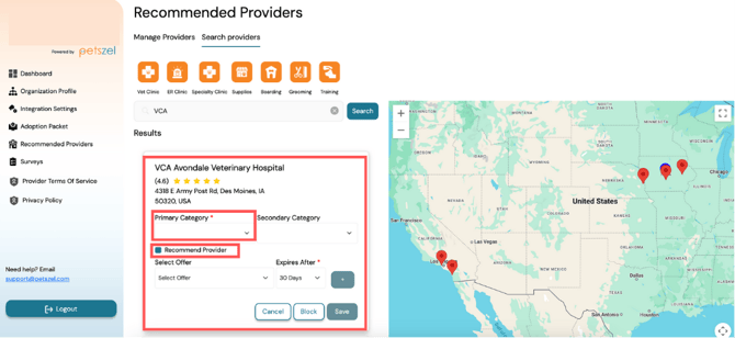(optional) Check Recommended Provider. The provider will now appear on the interactive map in your adopters’ app, complete with their location, website, and contact info and will be labeled with a ❤️, like this: