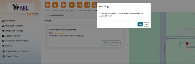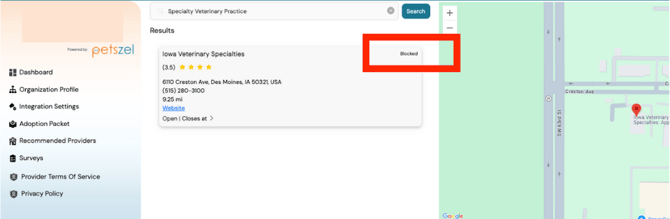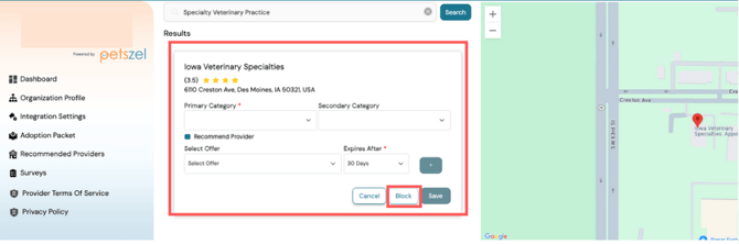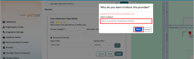 Choose a reason from the dropdown (does not use positive reinforcement methods, has a history of poor service or bad reputation, under formal investigation for animal welfare concerns, sources animals in a way not aligned with our mission). Click Block.